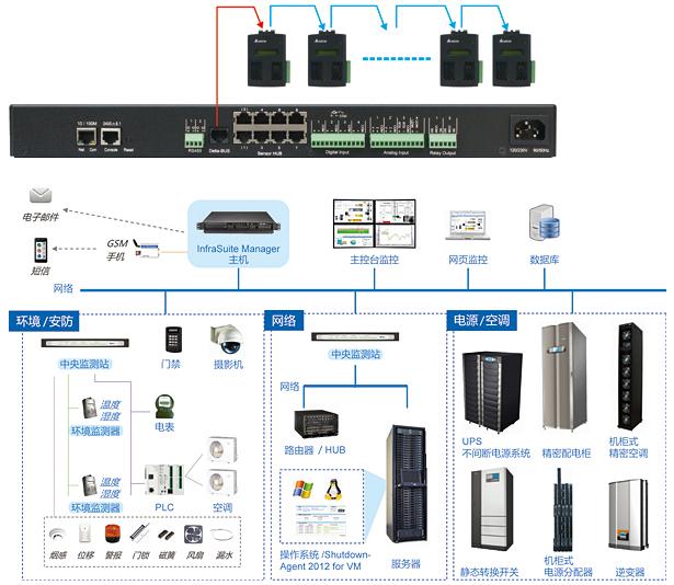• 中央監(jiān)測(cè)站及環(huán)境監(jiān)測(cè)器系列可以將偵測(cè)到的環(huán)境參數(shù)(溫度、濕度、漏水、煙霧、門(mén)窗…)回傳InfraSuite Manager。經(jīng)由InfraSuite Manager判斷后下達(dá)互動(dòng)指令。